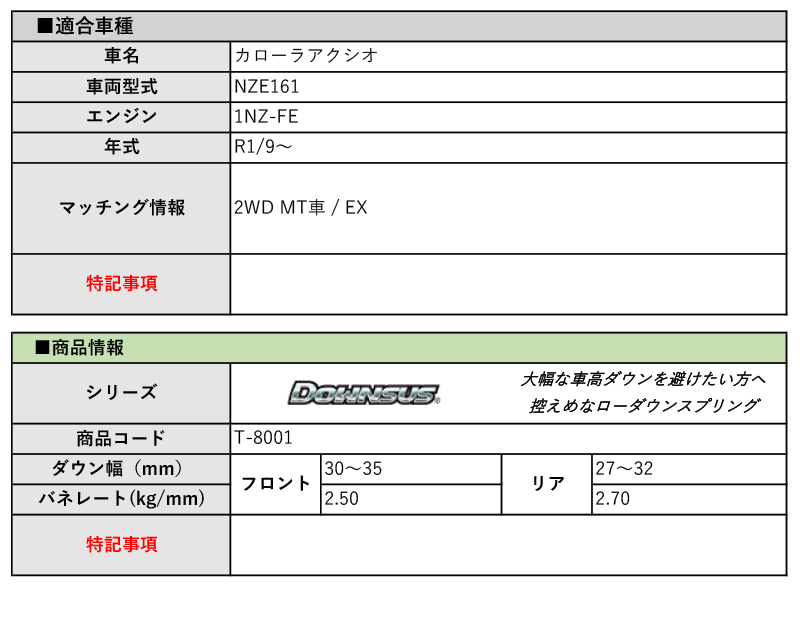 [エスペリア]NZE161 カローラアクシオ_EX(2WD MT車_R1/9〜)用ダウンサス[車検対応]